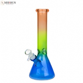 This 10-inch tall rainbow gradient glass bong is crafted from high-quality glass material. The downward-diffusing stem enhances water permeability, ensuring smooth hits every time. Equipped with a built-in ice catcher, it meets basic smoking needs. The color-changing glass series custom bong offers 4 color options, providing different effects from various angles. We also provide a range of special customization options to meet the specific requirements of wholesale customers.